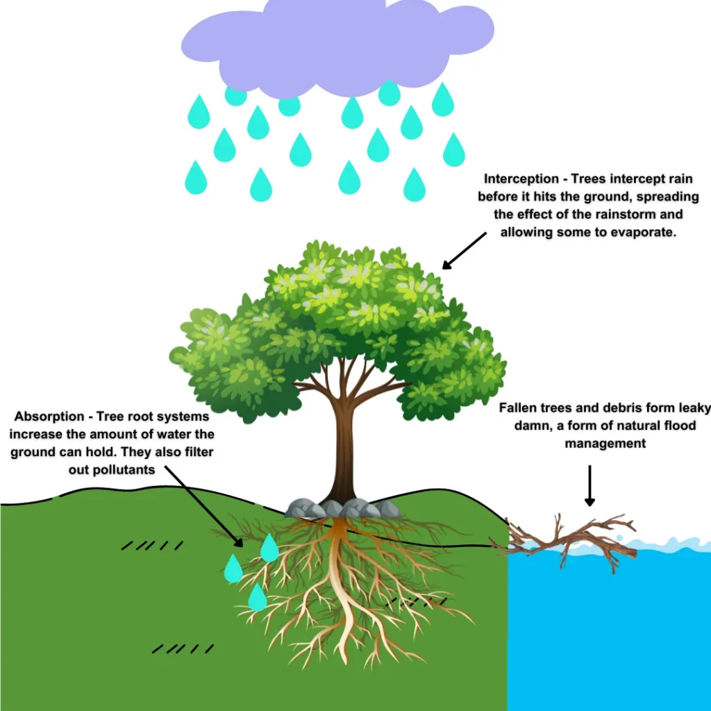 Trees act like sponges. When it rains, their leaves, branches, and roots slow down how fast water reaches the ground. This gives the earth time to absorb water, reducing the risk of flooding.