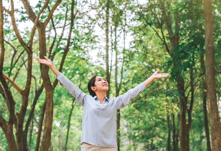 Being near trees and nature is good for your mood. Scientists have found that green surroundings help reduce stress, calm minds, and make people feel happier.