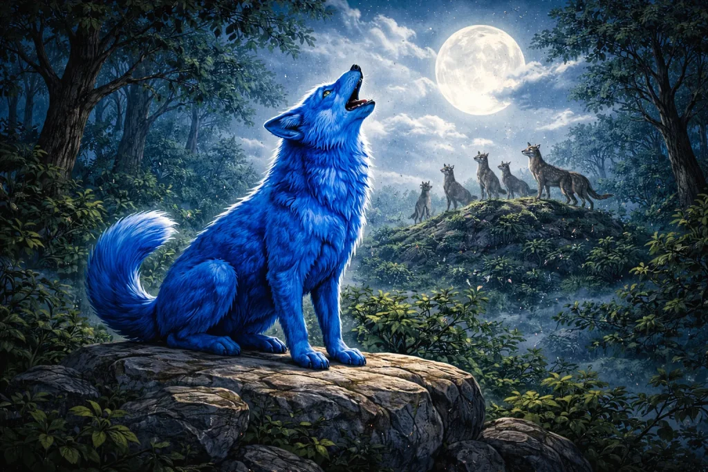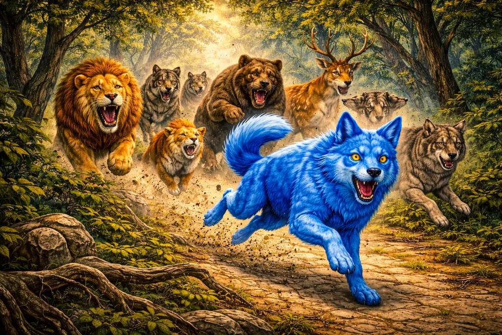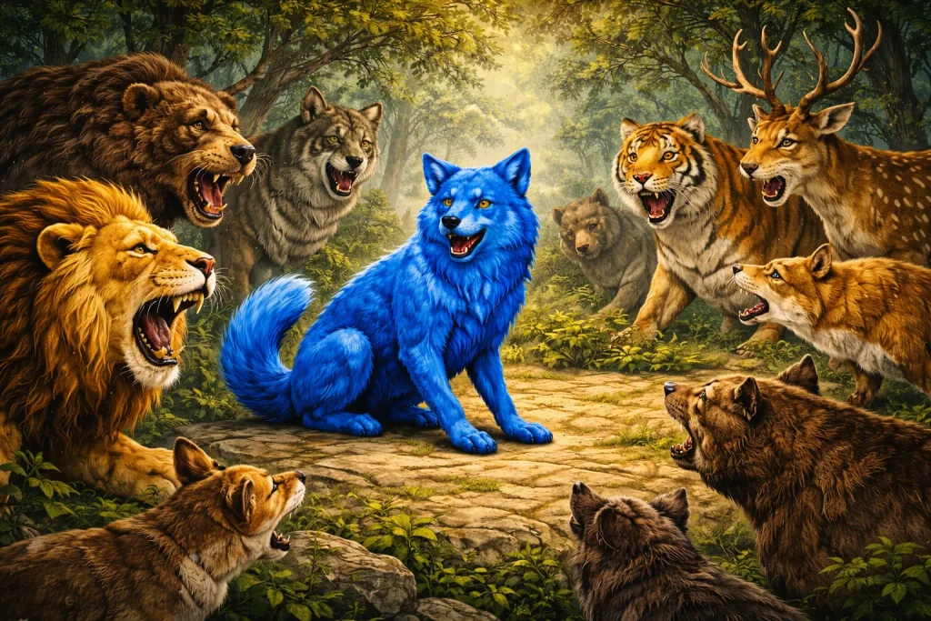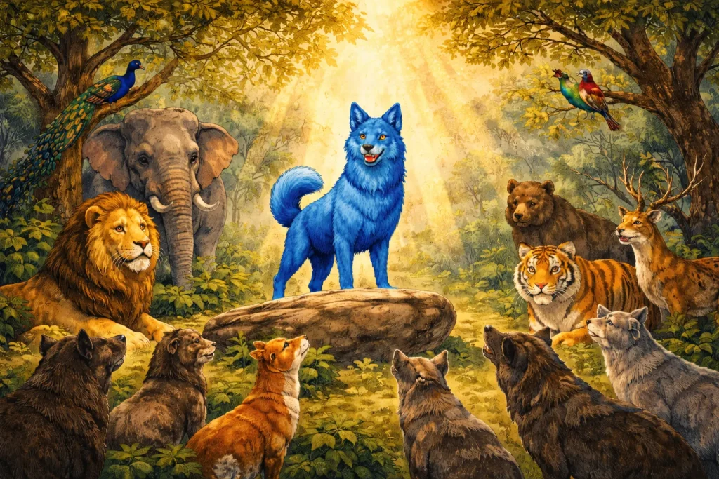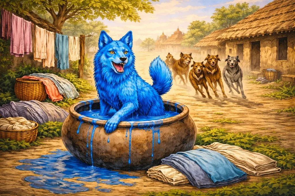 Once upon a time, a hungry Jackal was searching for food near a village. While running away from some dogs, he jumped into a big pot of blue dye kept by a washerman. When the jackal came out, his whole body had turned bright blue!