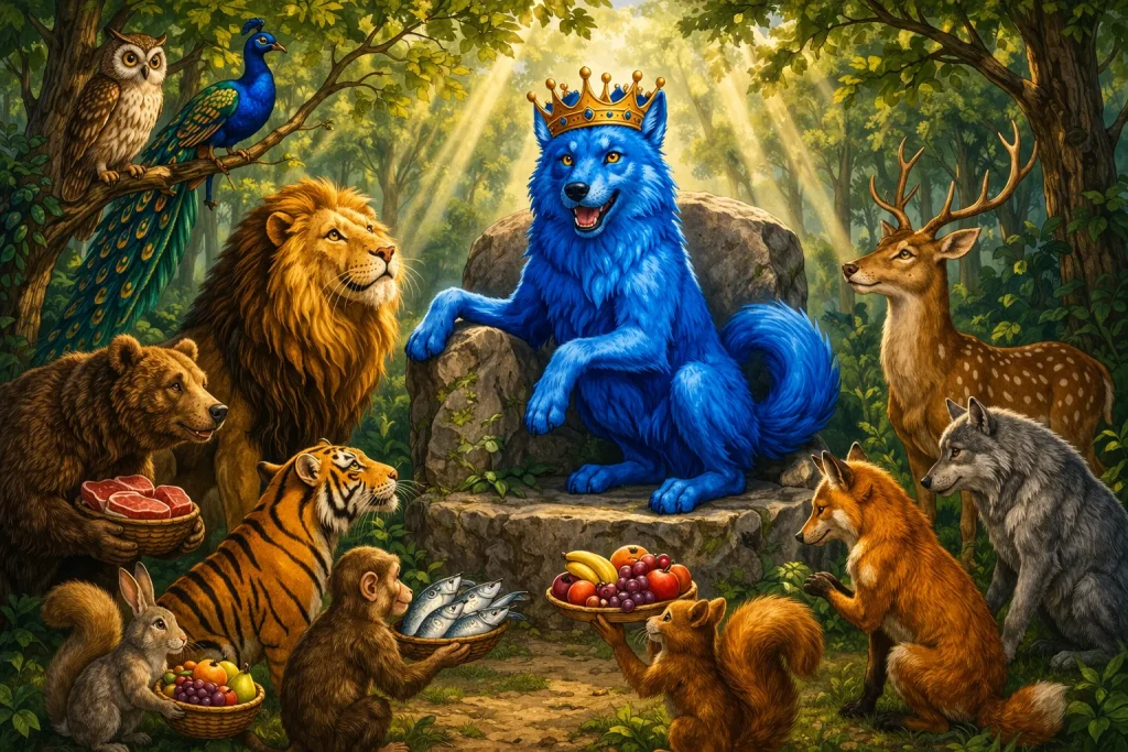 The animals in the forest had never seen a blue animal before. They were surprised and a little scared. The jackal cleverly told them, ‘I am a special animal sent by the gods to be your king.’