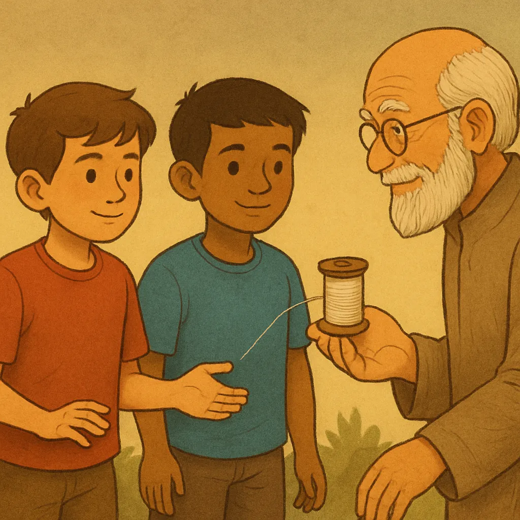 In a quiet village, two best friends lived: Aarav and Kabir. They did everything together—played, studied, and even fought sometimes. One day, a wise old teacher gave them a task. He handed them a spool of thread and said, ‘This is an invisible thread of friendship. Every kind act you do will strengthen it. Every mean act will weaken it.’