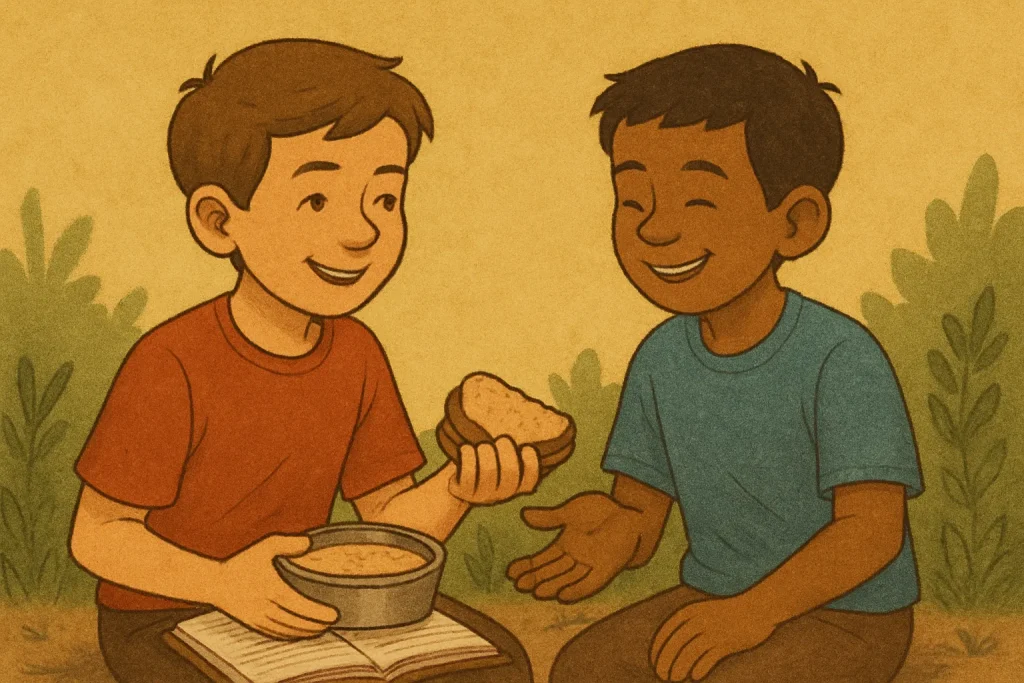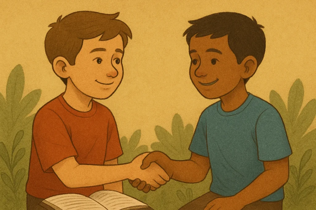 The boys laughed, thinking it was silly. But as days passed, Aarav helped Kabir with homework, and Kabir shared his lunch when Aarav forgot his. They felt closer and happier.