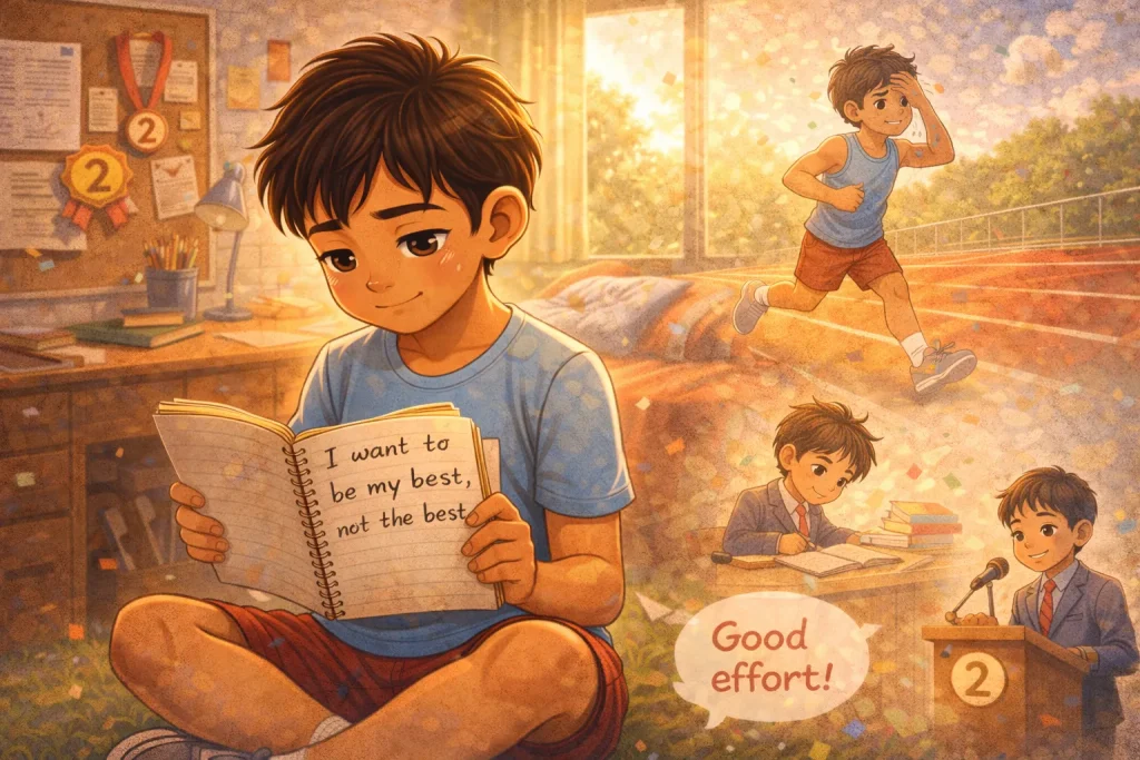 One afternoon, Aarav found an old notebook where he had once written, I want to be my best, not the best. The words felt quiet but powerful. From that day, he changed one thing. He stopped watching others and started improving himself, one step at a time.