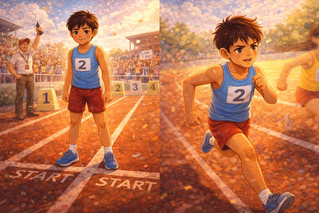 He woke up earlier, practiced harder, and learned from mistakes instead of hiding from them. On sports day, Aarav stood at the starting line with calm confidence. The race began. His legs burned, his breath shortened, but he kept running.