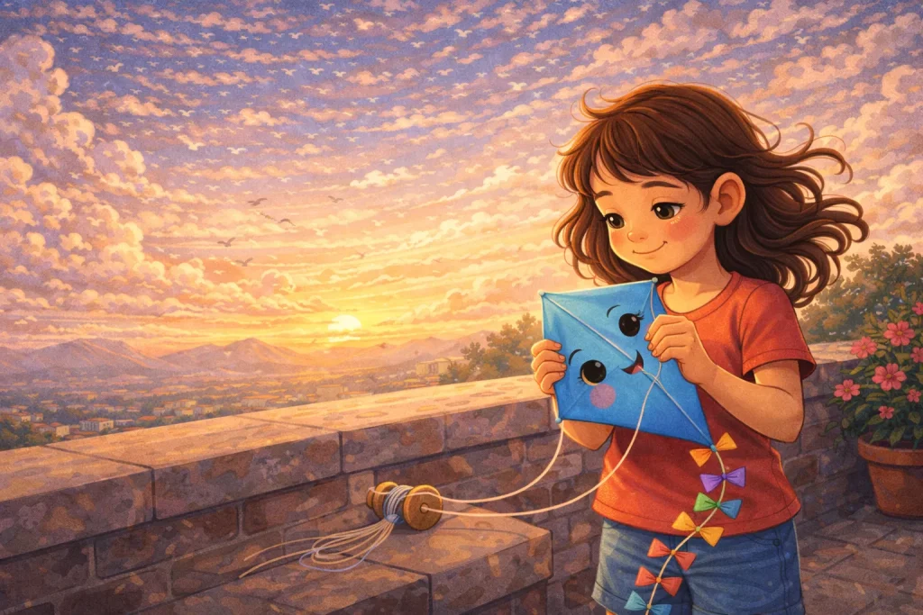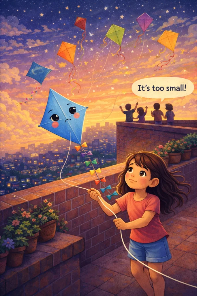 Riya loved flying her small blue kite on the terrace. Every evening, she watched big kites dance high in the sky. Her kite often dipped and fell. “It’s too small,” some kids said. Riya felt sad, but she did not give up.