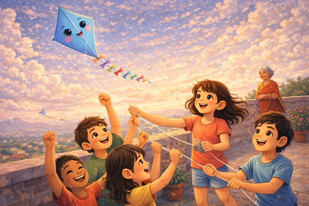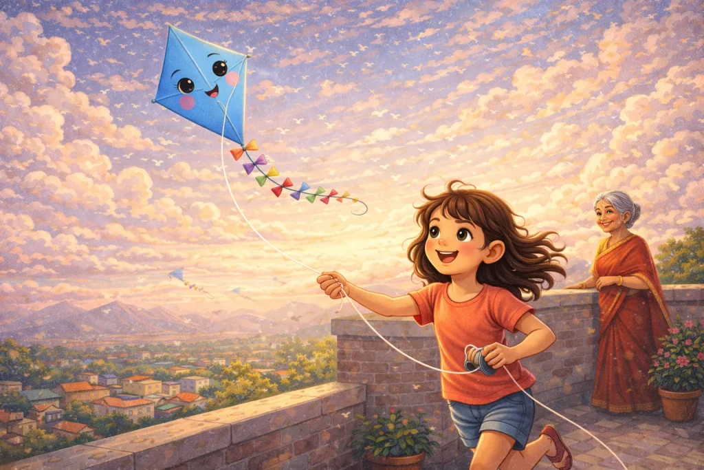 One day, her grandmother smiled and said, “Even small things can rise with patience.” Riya listened carefully. She practiced holding the string gently and waited for the right wind. She learned when to pull and when to let go.
