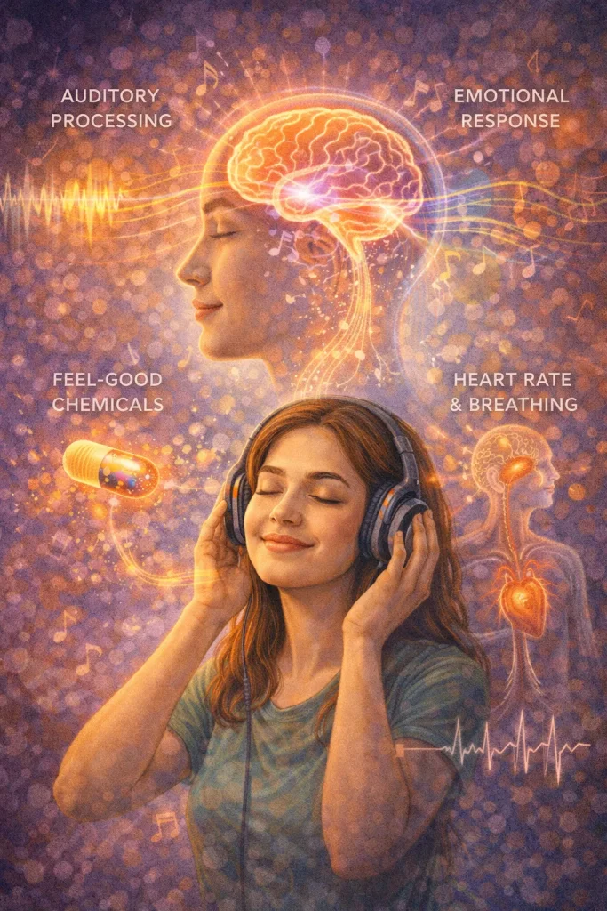 Music doesn’t just stay in our ears — it travels right into our brains! When we listen to music: