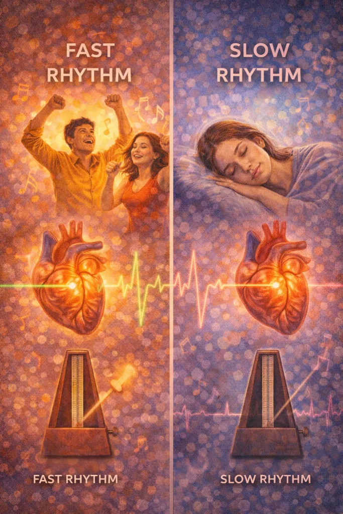 Music can also influence our physiology — for example, heart rate and breathing. For example, a fast beat can make your heart beat a little faster, while slow music can help your heart slow down and your body relax.