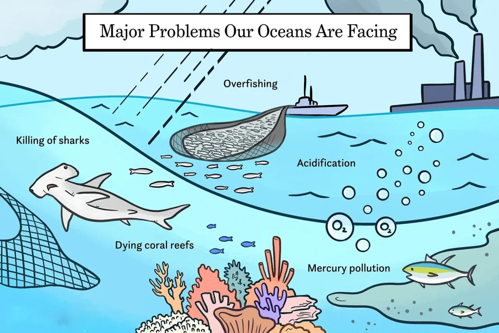 • Pollution: Plastics, chemicals, oil spills, and waste harm ocean life.